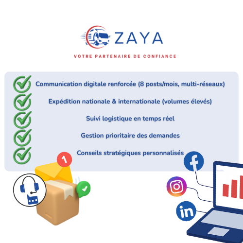 Le Pack Premium est idéal pour les structures ambitieuses qui veulent combiner une communication percutante avec une logistique de haut niveau. Nous gérons pour vous la création et la publication de 8 contenus par mois sur plusieurs réseaux sociaux, pour maximiser votre visibilité. En parallèle, nous organisons l’expédition de vos colis en France et à l’international, même pour des volumes élevés, avec un suivi logistique en temps réel. Vous profitez d’une gestion prioritaire de vos demandes et de conseils stratégiques personnalisés pour optimiser vos opérations.